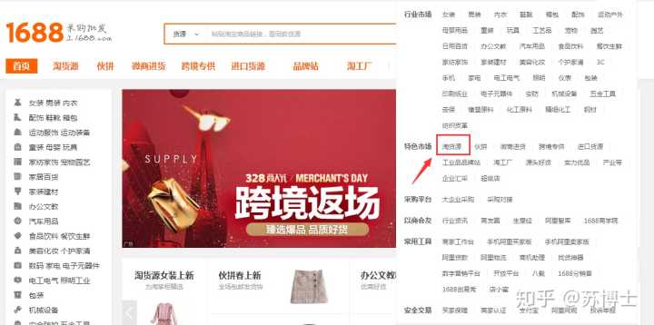 3)登录之后,我们在主界面,即右上角的导航处点击下,看到下面有很多选择,其中【特色市场】下面有淘货源。