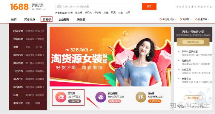 4)我们点击进入淘货源界面,左侧有很多关于商品的类目导航,点击【袋发帮】。