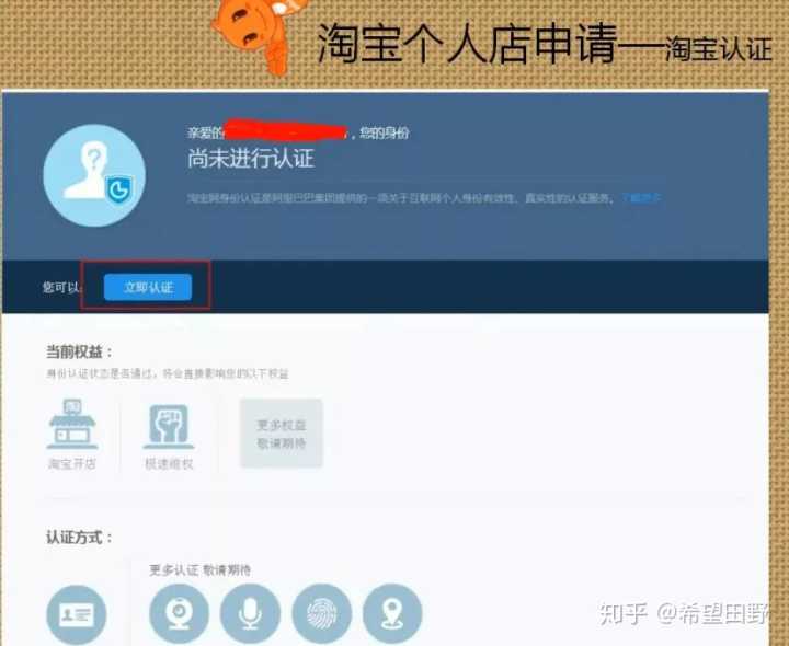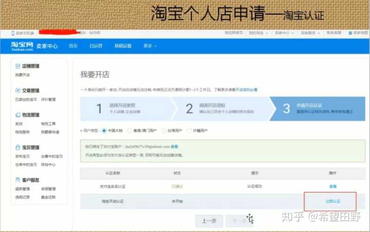 点开免费开店后就会进入下个页面,然后找到【淘宝开店认证】→【立即认证】。