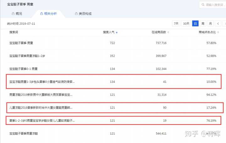 将“宝宝鞋 夏季 男童”舒服到生意参谋进行搜索,可以看到其中红色标记的三个细分类目竞争明显相对较低,而且是搜索人气大于在线商品数的。