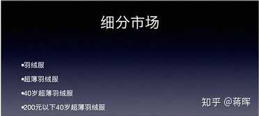 比如说你想要卖羽绒服,羽绒服这个市场本身非常的大,首先进行切分,有男款羽绒服、女款羽绒服、薄款羽绒服、超薄款羽绒服、厚款羽绒服、超厚款羽绒服等等。