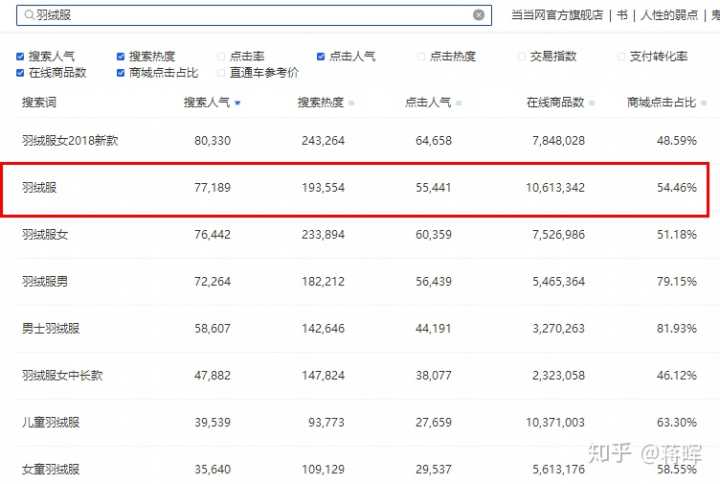 所以“羽绒服”的关键词倍数也就是,77189/10613342≈0.007