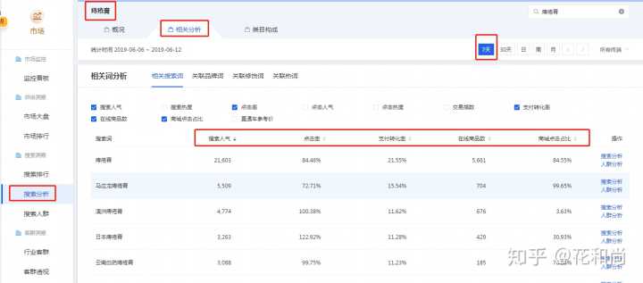 打开生意参谋中的市场行情,点击搜索分析,输入你选择的类目词,再打开相关分析-相关搜索词,参照最近7天的数据,看搜索的大词