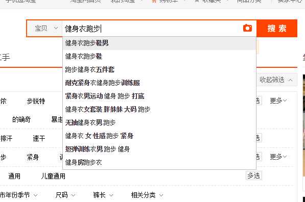 在淘宝上打上健身衣、健身衣跑步进行搜索,我们可以看到很多种类选项。常见的有跑步套装、紧身衣、健身房专用、瑜伽健身衣。。。。