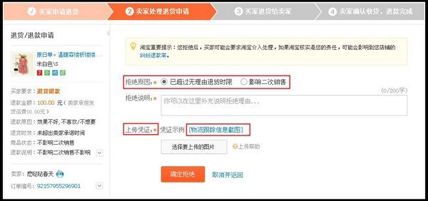 第二步:填写拒绝理由,并上传有效凭证(点此查看退款凭证的有效性说明),再确认点击”拒绝退款协议”。