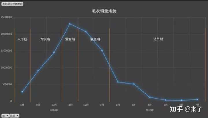 通过信息图我们不难发现,【毛衣】是一个具有明显季节性的类目,其销量从 9 月开始快速增长,到 11 月达到最高,12 月销量开始下滑,2 月开始退市。根据这些特征,可以把毛衣的市场趋势划分成 5 个区间,分别是入市期、增长期、爆发期、衰退期、退市期,如上图所示: