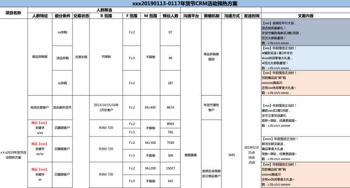 从下图中我们可以清晰的看到针对三项指标不同的人群,数据赢家为商家设计的文案内容是不同的,从活跃客户、沉默客户到流失客户,或从新客户、老客户再到成熟客户等,依据不同的人群数据、不同特点设置相异的文案内容,刺激用户消费。