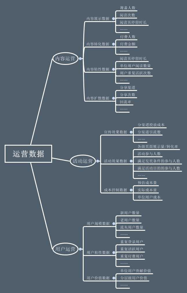 这张脑图,仅仅简单的展示了可能是通用的部分运营数据,但如果我们仔细去看,会发现三个数据类型,是所有运营都需要具备的: