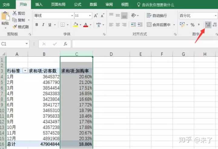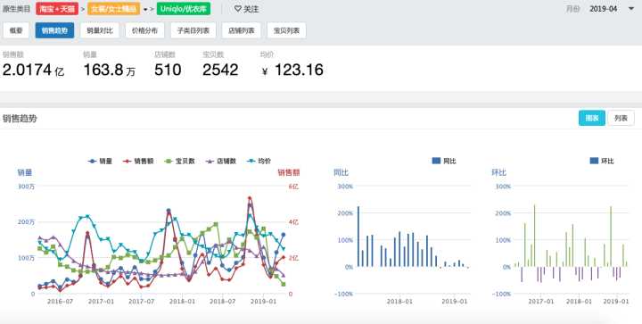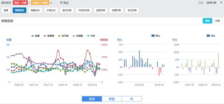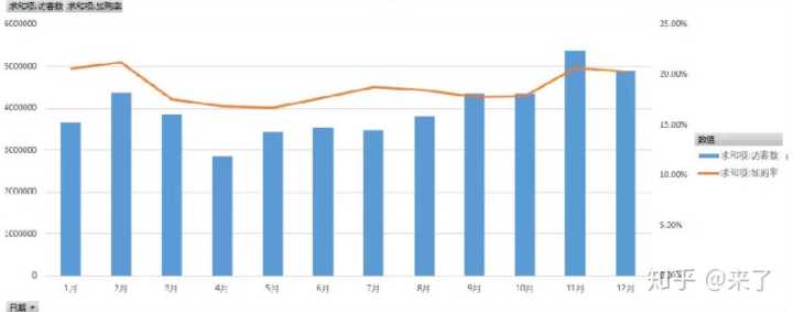 我们不妨把观测的时间粒度转换成【月份】,在图表右下角单击【+】号。效果如下图所示,按月份展示数据就有了可读性。