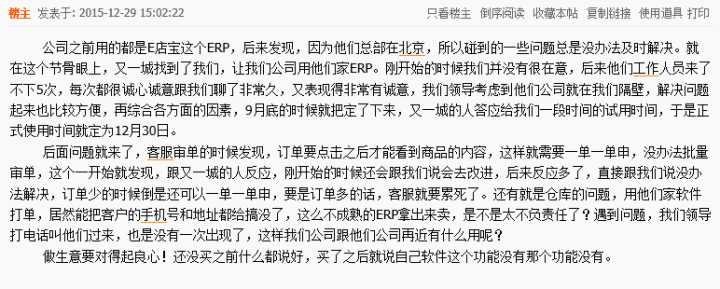 小型级别的商家,如果你出不起价格2万起的软件同时又对网店管理要求没有那么严谨的,建议你找哪些我不知道的ERP服务商的或者是价格很低的商家谈,按照中大型的商家的方式去谈合作,一来,你又不需要话费那么大,二来你在软件适用性上会体验的更强。三来人家小ERP服务商也会重视对你的服务!双赢局面,坦率的说,如果你出不起钱,价格压的死,又要大软件给你用。后面的结果是:软件功能操作繁琐、销售人员对你不积极,服务人员服务响应速度慢!说白了,你的消费力就是现实,别拍砖,事实如此!别怪别人现实,社会就这样!