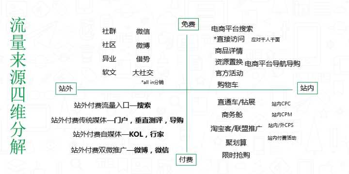 首先,我将流量分为4个维度–站内,站外,付费,免费。