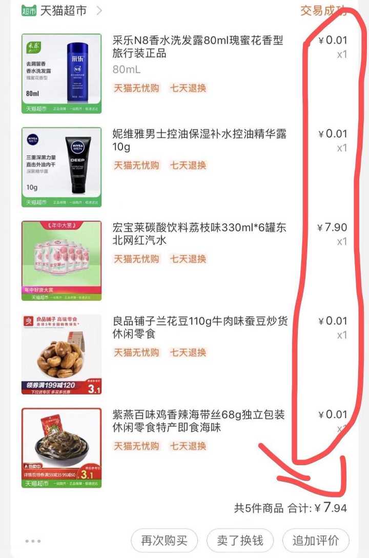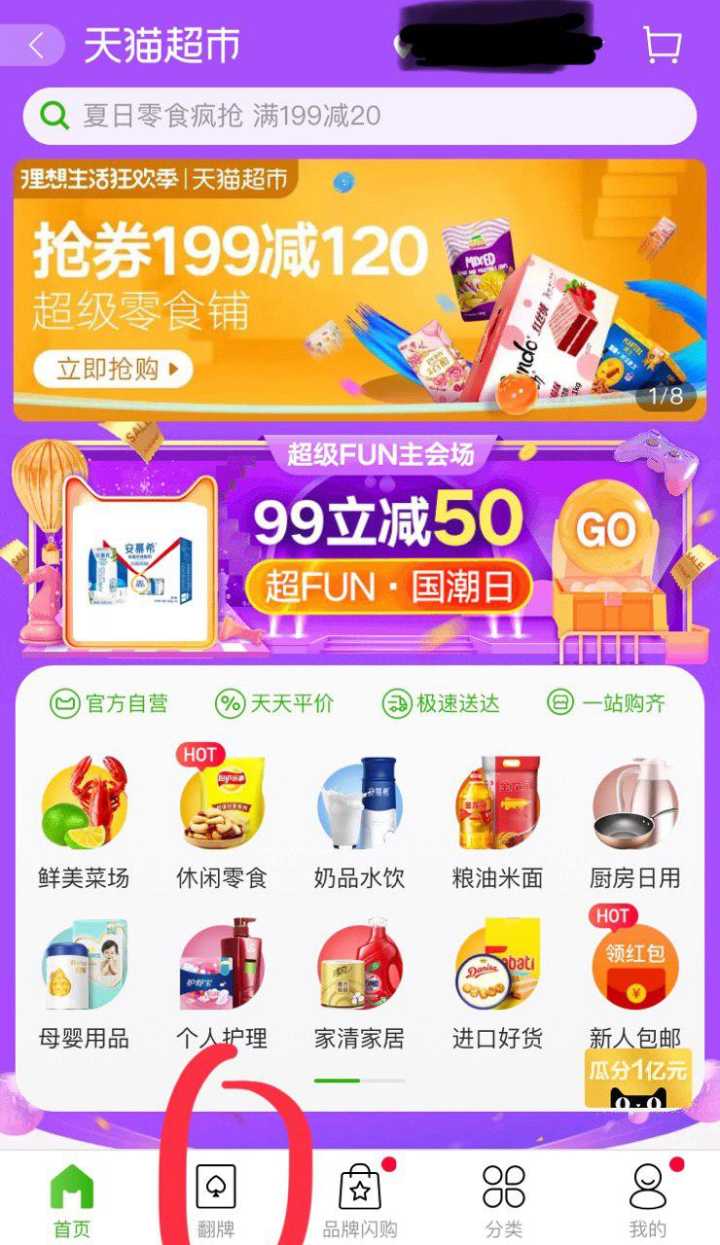 天猫超市一分钱购,生活必不可少的。从天猫超市进去-翻牌-如图