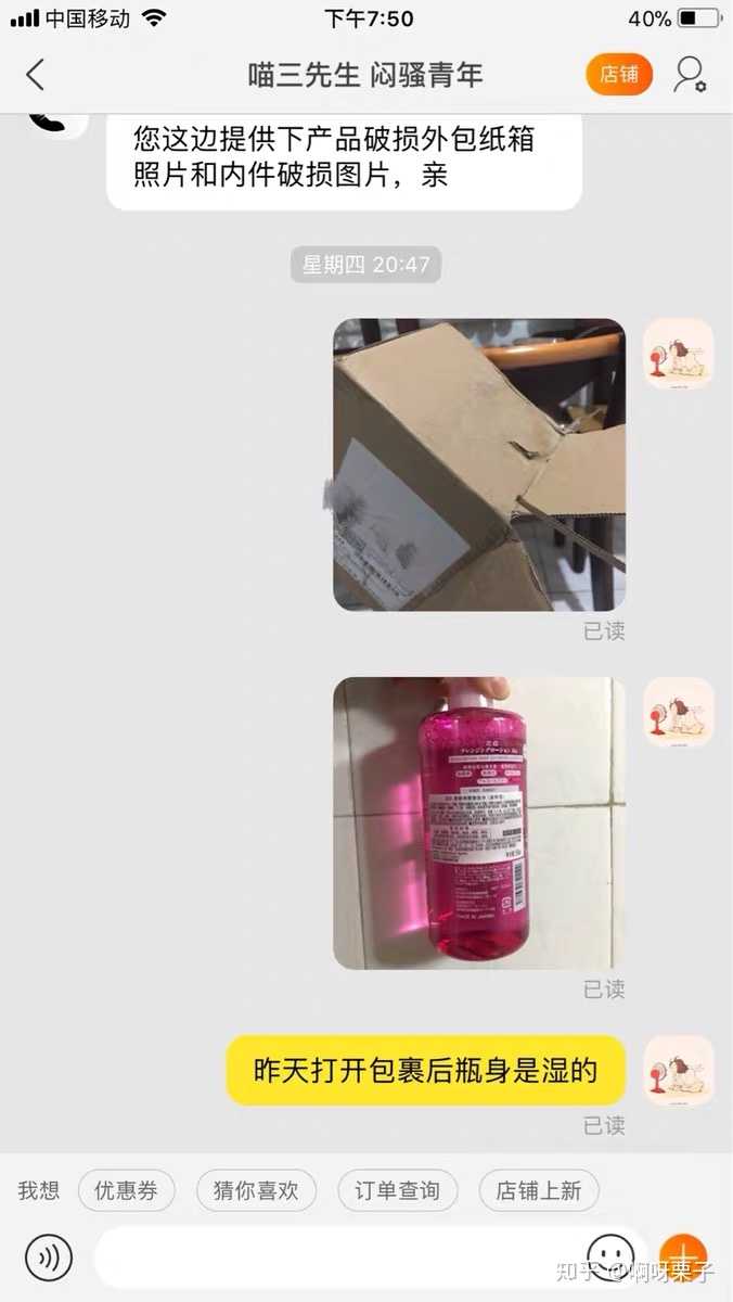 快递送到时我本人不在家,快递给我打电话后我让她把快递放在小区门口小卖部,晚上回家后拿到快递回家,包装是这样的,纸盒里面有一个塑胶袋,隔开装着一个大瓶一个小瓶,撕开后大瓶漏水,瓶身是湿的,小瓶完好,这时候我再去看包装盒才发现包装盒底部已经被漏的水浸湿有水渍,以下是我和卖家交流的聊天记录