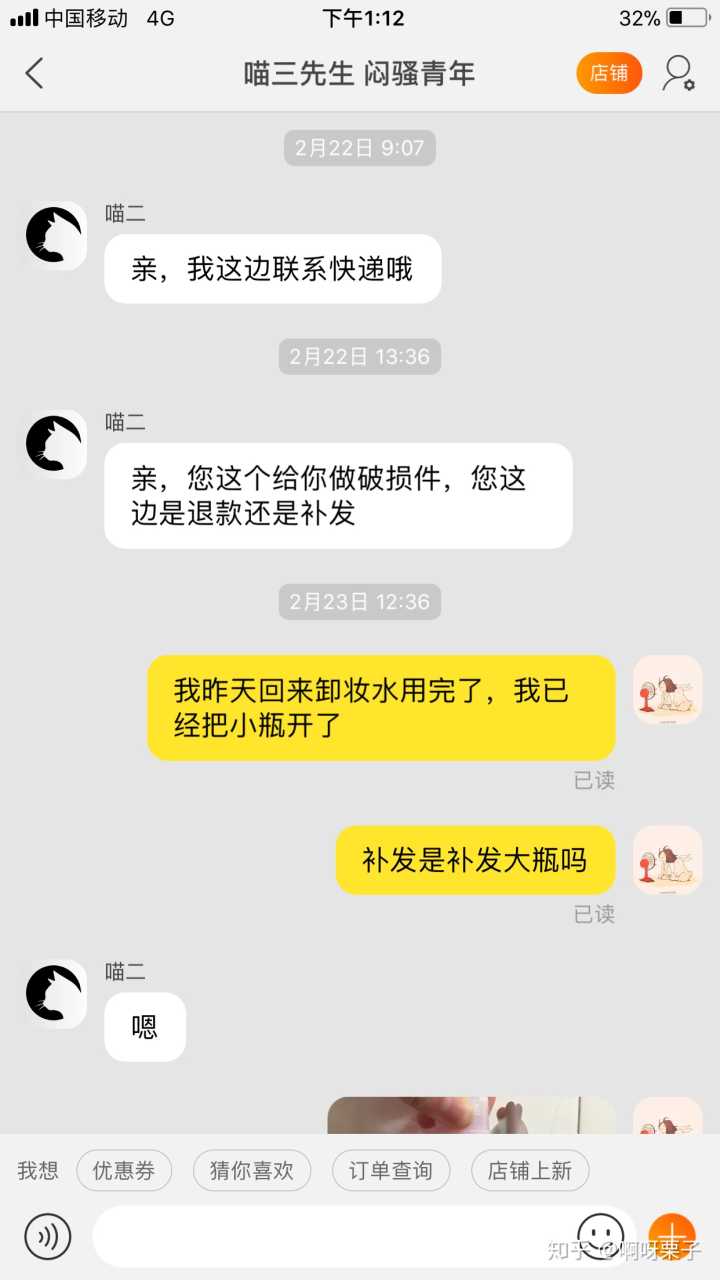 卖家客服在线时间是上午九点到下午5.20,我一般晚上回家才想起来看淘宝回复,所以我发消息后都要等第二天他再回答,2月22日卖家说补发大瓶。