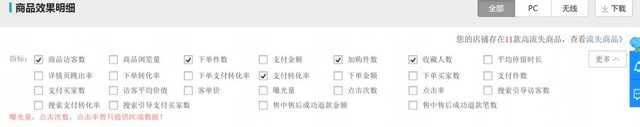 在商品效果中,提供了很多字段供我们研究和分析!因为今天我们要解决的核心问题是选款,所以,只要打开以下这些字段“商品访客数”、“下单件数”、“加购件数”、“收藏人数”、“支付转化率”5个维度,如下图: