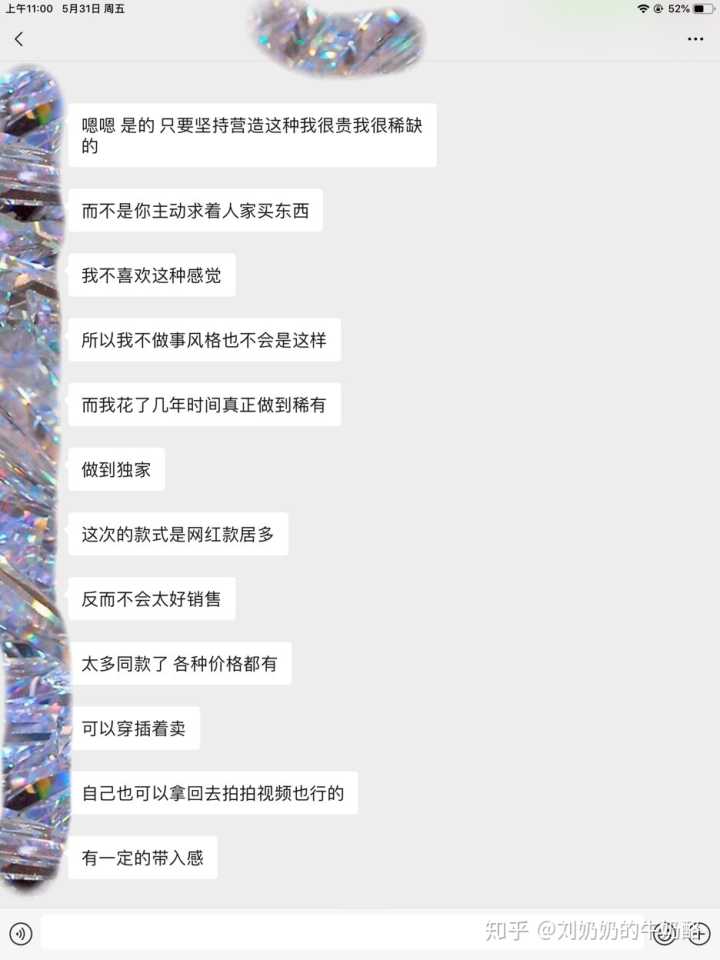 现在我也有了一些代理 其中大多数是跟了我很长时间的 也有跳槽来我这里的 之前有一个代理和我说她之前跟的那个上家特别不负责 经常不更朋友圈 也不怎么帮她们发货 我当时就惊呆 了 如果你没办法承担起收代理的责任 那就不要去收 这种收代理的做法已经是在骗人了 然后她和我说了一些她的经历之后就加入了我这 毕竟我是一个风雨无阻发圈打单发货的小仙女