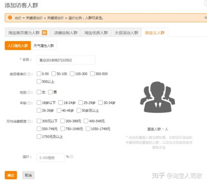 简单的来理解就是针对选中的人群,关键词出价会按设置溢价的比例提升,访客对圈定人群投放时的展现量,如下图所示 访客人群群体很多,大家可以更具自身产品的特点圈定合适的人群 ,如 天气 节日 年龄等
