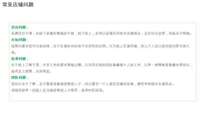 诊断店铺的范围相对来说比较广,其中包括访客走势、产品销量、营销策略、推广效果、活动绩效等。不仅需要我们具备数据分析能力,更重要的是要有明确的思路,我们要学会从一些蛛丝马迹洞悉店铺问题。比如发现店铺的某一项动态评分无故降低,你会简单的认为仅仅是这一项出了问题吗?你要知道,买家评分是很盲目的,如果他的心情不爽,往往不会仅仅对你某一项评分给出低分的。所以,我们要做的就是让买家只要买我们的东西就很爽,至于怎么爽,这就是你应该认真思考的问题了。