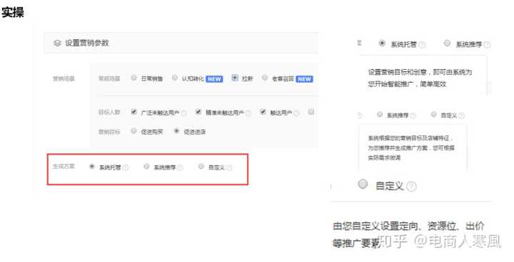 目前分为三个营销目标,分别是全店推广的“全店日常销售”和“全店自定义”,还有单品推广的“单品自定义”,全店日常销售分为两部分,“系统托管计划”和“系统推荐计划”。