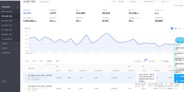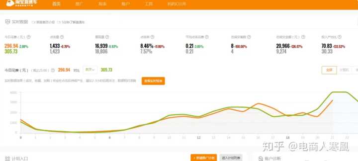 在全店推广计划的计划首页,我们可以看到所有计划的当日总预算,当日预算消耗占比,同时能看到消耗、展现量、点击量、点击率、千次展现成本、点击单价六大指标的当日数据。