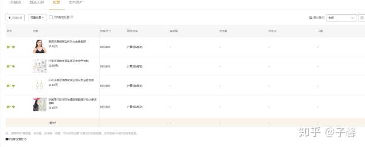 2.2人群设置完成以后,接下来我们开始创意的设置,在设置创意的时候,我们分别把标题拆分成4个不同的标题,然后用4张不同的主图,这样的好处是能在测款计划完成以后,完成我们的测图。如下图所示: