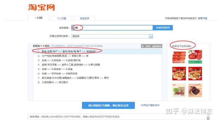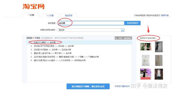 1、官方宝贝发布入口, 系统推荐的第一个类目就是最优的类目。同时,我们可以看到在右侧有相关的产品展示图,也就是通过相应的词可以看到相关的产品是不是符合自己产品定位特点的。如果旁边的连衣裙和你发布的连衣裙没有一个类似的,那你就需要在第2-6条查看其它的图。