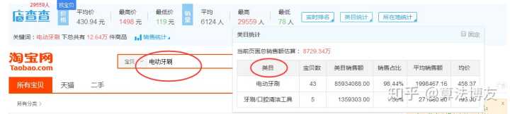 3、第三种发布时类目的选择方法:第三方插件进行数据参考。比如店查查看同行选择什么类目去发布。电脑搜索框搜索你的产品词,然后可以看到目前大家都在哪些类目进行发布的。都有统计,如下图。43个产品是电动牙刷类目,5个产品是牙刷/口腔清洁工具这个类目。