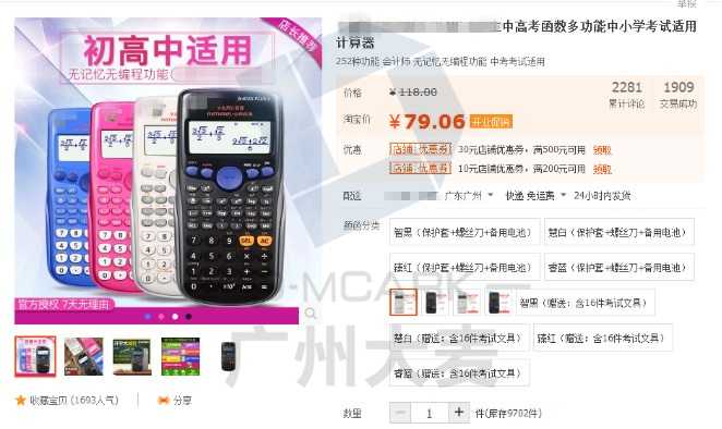 店铺主营类目是电子词典/电纸书/文化用品,主推产品是卡西欧计算器,如下图。客单价80元左右,流量为200,日营业额小于800元,店铺层级为第二层级。推广三个月后,店铺层级跃升到第五层级,日营业额达到8000以上,比之前翻了10倍。每日流量翻了6倍以上。