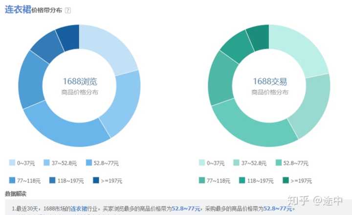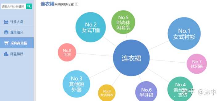 五、从采购素描来看,我们主要看关联行业;关联行业越大,所示的圆圈也就越大。这地方我们可以看到,该产品和衬衫、t恤、短外套、蕾丝雪纺衫都有比较大的关联,所以我们可以侧重筛选这几个来做好产品的推荐与关联搭配;