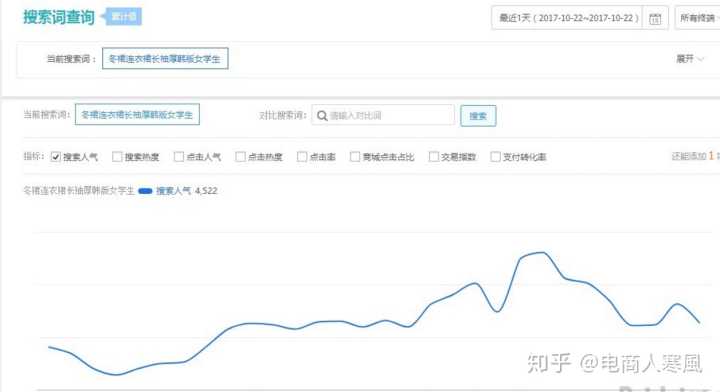 例如我卖的是连衣裙,我通过这个核心关键词来查询整个类目下的大盘情况,查询结果页面会显示该关键词对于的行业大盘趋势,并自动对应该词的主营类目和采购指数排名