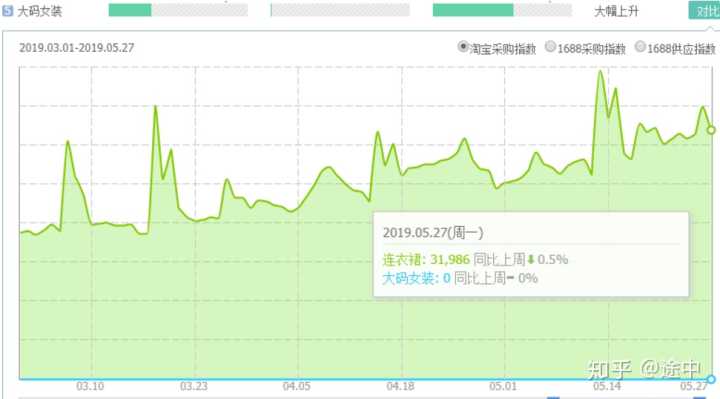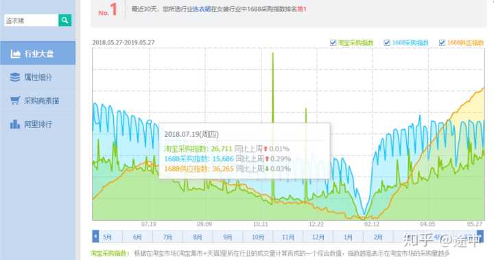 三、行业大盘默认显示的是最近三个月,我把时间拉长到最近1年的,可以看到最近一年的淘宝采购指数、1688采购指数、1688供应指数;可以看出它从2月中下旬开始呈现直线上升的趋势,说明年后回来市场回暖,大家都提前布局新品,侧面反馈出服装具有很强的应季性,至少要提前2-3个月去布局我们的产品;