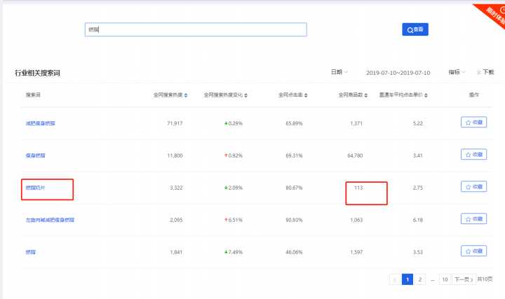 当指数出来之后,关键词 “燃脂奶片” 的搜索热度为3322,说明搜索该商品的人数众多,全网商品数只有113个,说明卖家少,竞争压力也不大!