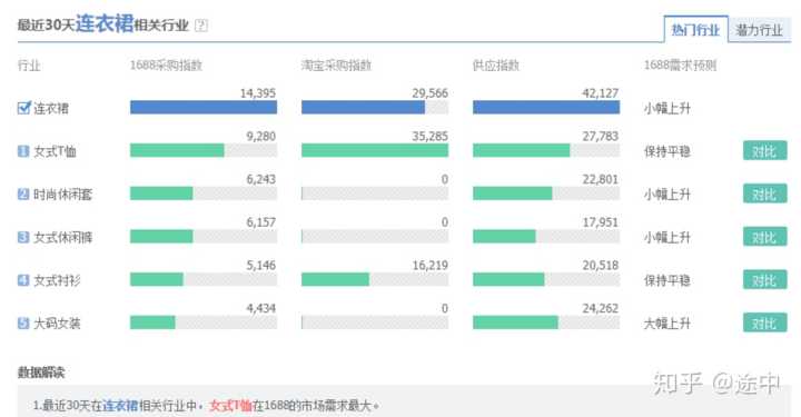 这是最近30天连衣裙下排名前五的行业需求;可以得出女士t恤位居首位且趋于平稳;大码女装这个行业下在呈现大幅度上升的趋势,这时候你就应该有意识的去关注一下大码女装行业下的人群和产品了;