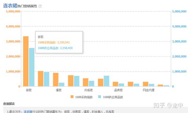 从热门营销属性中,我们可以大致判断出,我们如果切入到连衣裙这个市场中进来,不应该做单一爆款的思路,而是应该做全店动销,持续性选款持续性上新持续性破零持续性推送,可以让店铺的流量得到快速更新迭代;