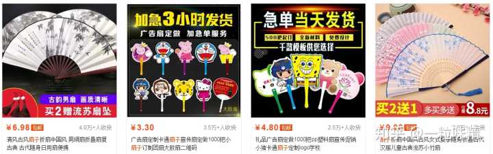 例如扇子,有折扇、团扇、蒲扇等等,其实扇子的样式是非常重要的。现在扇子都会加上中国风、古风、卡通这些元素标签,总会受到不少女生的欢迎。