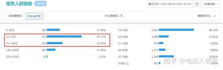 从价格带数据分布来看,以低客单为主,作出推测面向的人群主要以学生群体为主,那么我们可以跳开低价位款式和人群,升级产品的包装、服务等等,定位中高客单的群体;