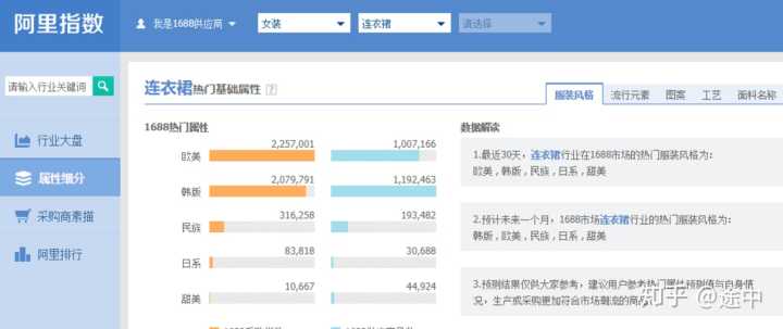 四、接下去可以看到连衣裙下的热门属性细分,右边依次对应的是服装风格、流行元素、图案、工艺以及面料名称,以服装风格展现的数据来看是以欧美和韩版为主,这时候我们应该思考,不同人群不同风格不同特点下的两个大蛋糕是否有细分的小蛋糕?
