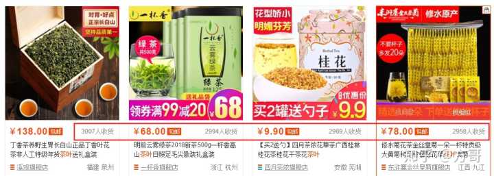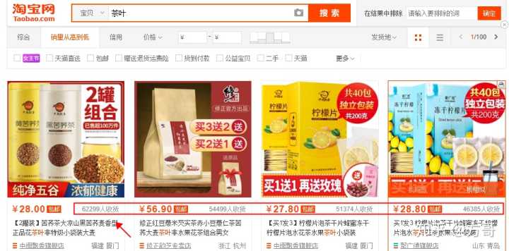或者实在没条件的可以直接从淘宝搜索引擎获取数据,找到自己相关的产品键入关键词信息,按销量排序,可以看到头部商家的销量情况,这个数字就是类目的市场容量上限,销量指数越大则类目相对进入门槛就更高,如下图,“茶叶”关键词下的宝贝销量排序首位月销6万+,属于高销量类目,容量大商家数量也相对大,竞争烈度高,进入门槛相对较高。