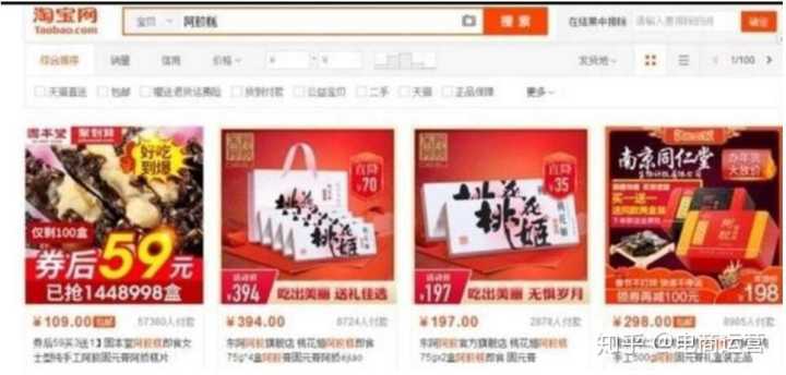 举个例子吧,拿【阿胶糕】来举例,在淘宝上搜索【阿胶糕】,就会发现主卡位(最前面),成交量得是5万多人,定价区间为如图所示,价格会偏低。