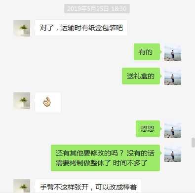 我们这行因为是手工艺品,需要客户确认的,比如说头部做好了,发给客户看,哪里要修改的会按照客户要求修改好,确定了之后就烤制做身体,身体样品出来后也会给客户看,经过客户的确认之后烤制做整体,整体出来之后也会发给客户确认之后才会发货。