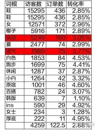 我们通过两个维度挑选出了商品的特点:1.特点肯定要迎合大部分消费者认同的,所以要在访客数高的词根里面选。2.一定是挑转化率高的特性词:转化率低意味着消费者不认同,“白色”“鞋”只是宝贝的基本属性,没有解决消费者欲望。