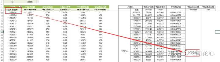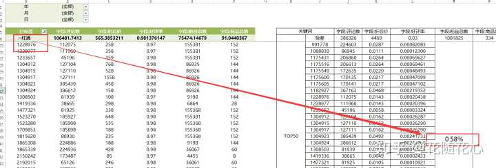 实际上,可能这么讲有点绕,意思就是说我这个数据表格里头的0.58%,是从占比平方当中,挑选TOP1-TOP10的数据相加得到的。