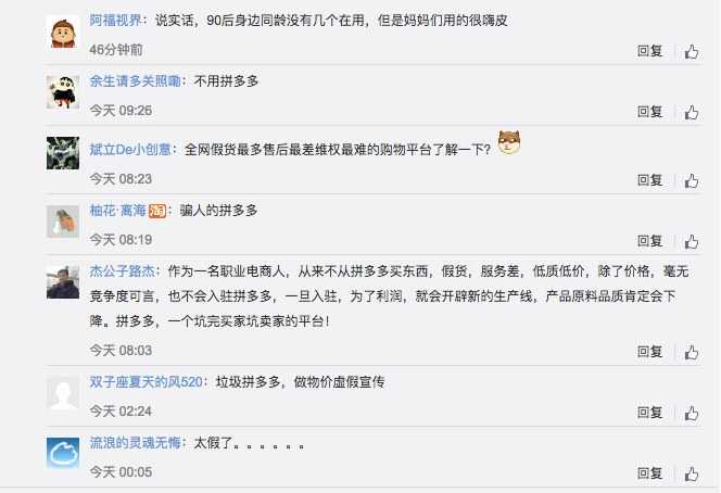 当然,与便宜相伴而生的便是对产品和服务质量的隐忧。拼单产品质量差、假货横行、服务不周到等等,这些都是拼多多颇为用户诟病的问题,只是在低价的诱惑之下,这种拼团模式总能找到自己的生存空间。
