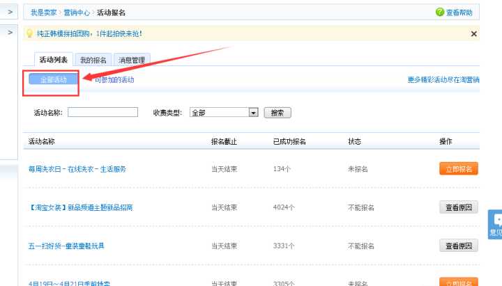 淘宝官方的活动集市店铺就天天特价有点效果,要求1钻到5钻信誉。其他淘宝的活动也有很多,店铺后台卖家中心有一个活动报名: