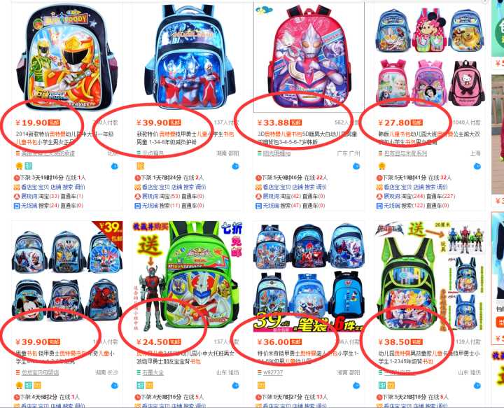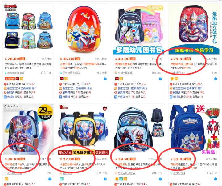 单纯搜“奥特曼 儿童书包”搜索结果里,价格基本都在39以下,目测29以下是销量更好,那些什么四五十,八九十月销量几十个的也有,先不说他刷没刷,就说如果是真实的销量,这点销量产生的利润,能够你吃喝么?