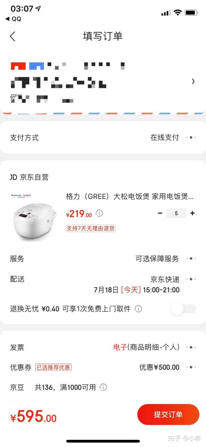 但是昨晚就被我们的系统发现了他有一张1000减500的优惠券,然后我们用这个优惠券下单了5台格力的大松电饭煲,你就会发现只需要595元就能得到5个大松电饭煲,平均起来就相当于119一个比他的活动价整整低了100块。