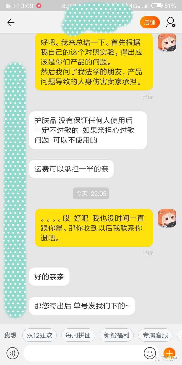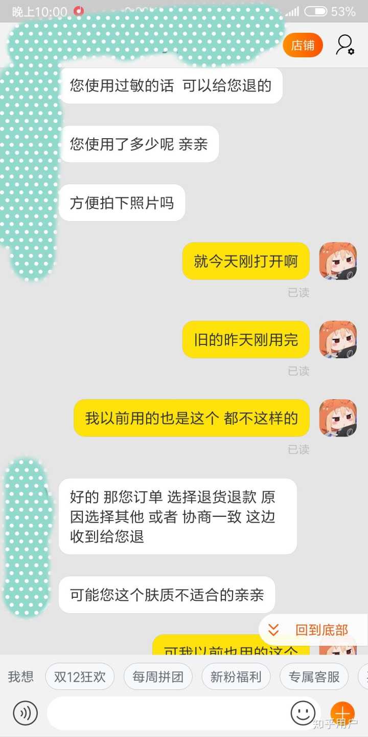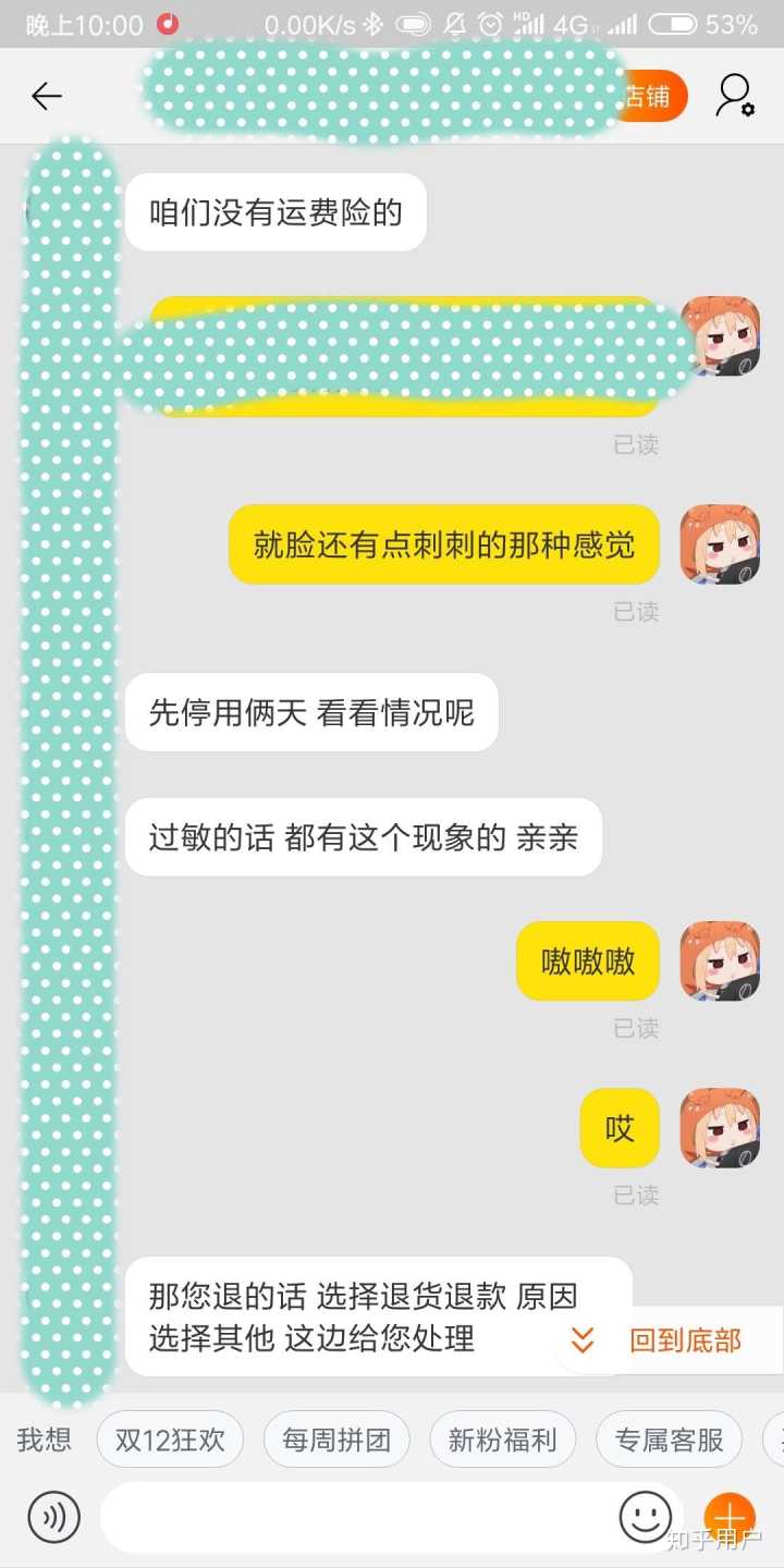 然后我就去和客服去说,这种情况她应该包运费的。都这样了,那个客服,居然还说因为我肤质的问题,并且一个劲说她自己用就么的事…..烦人的,我上截图吧。