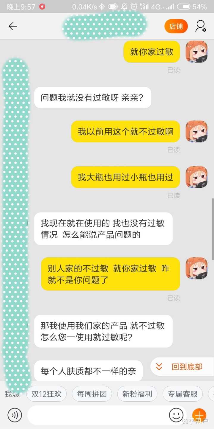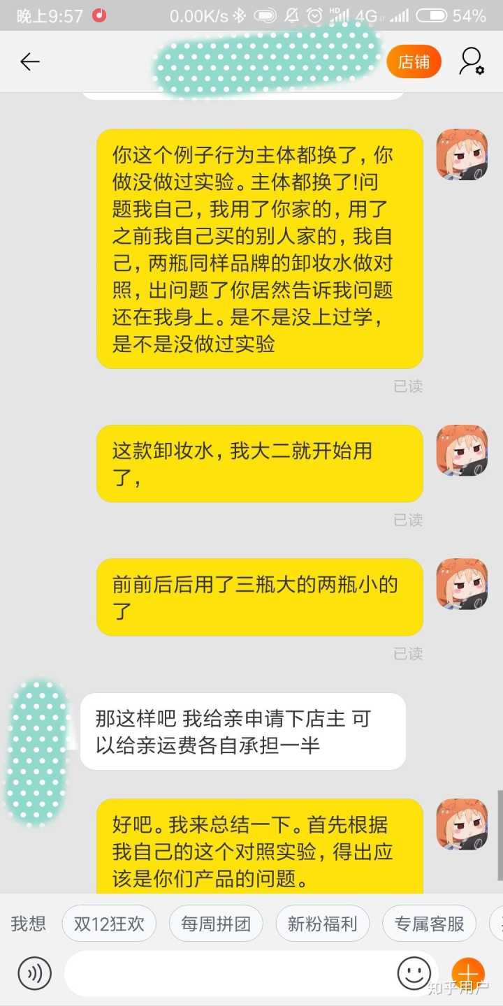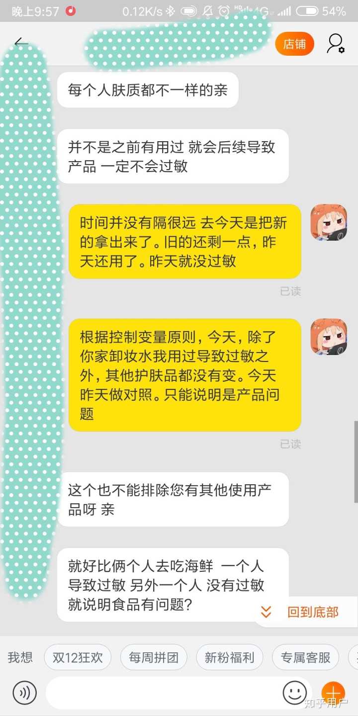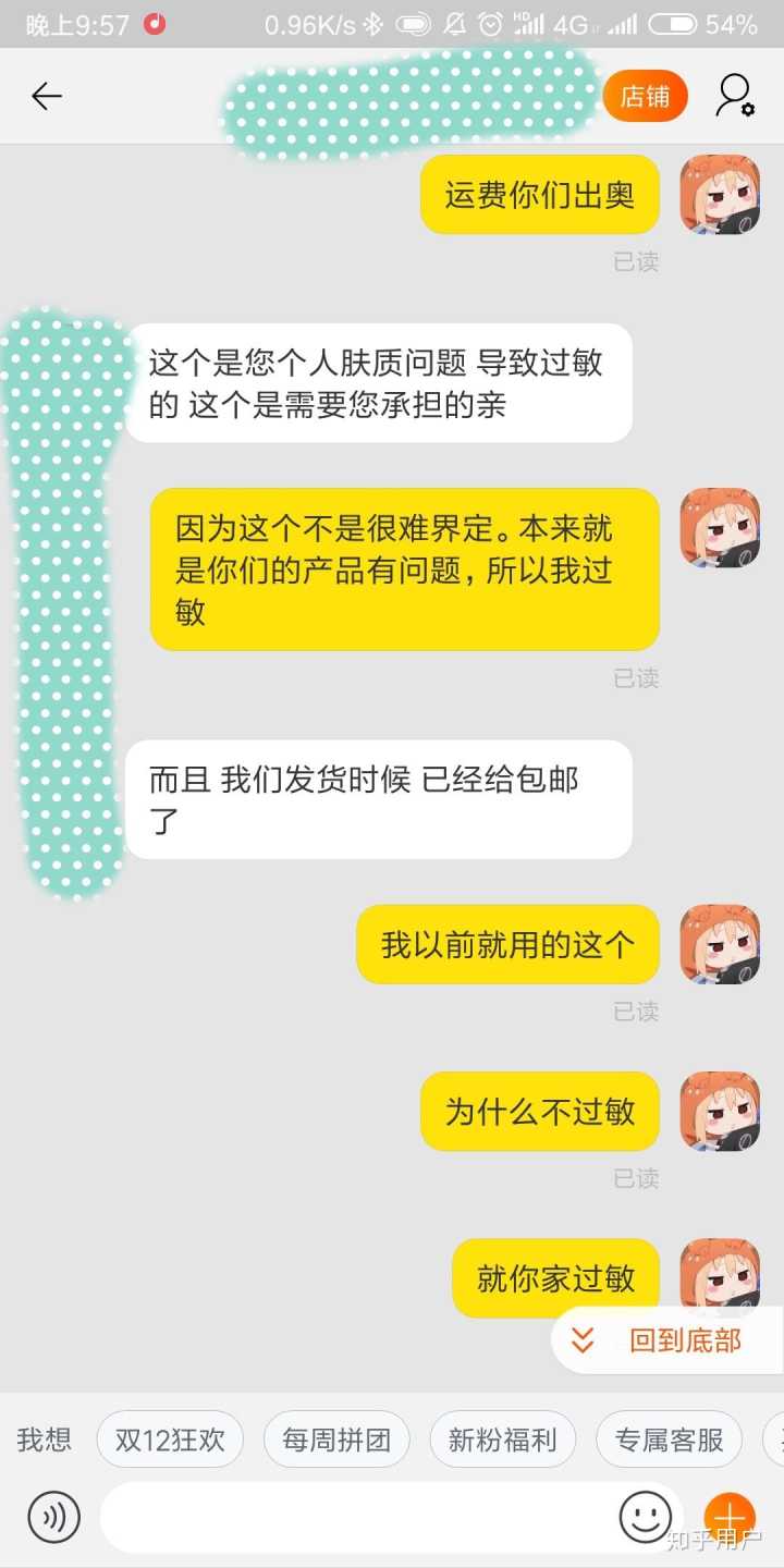 然后我就去和客服去说,这种情况她应该包运费的。都这样了,那个客服,居然还说因为我肤质的问题,并且一个劲说她自己用就么的事…..烦人的,我上截图吧。