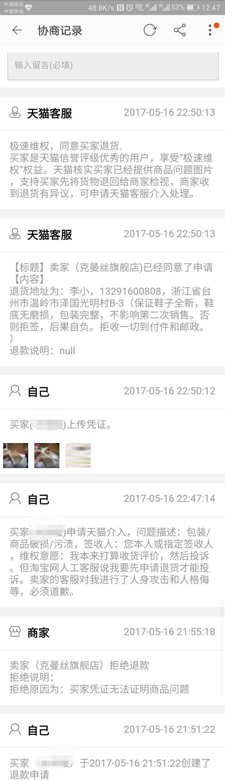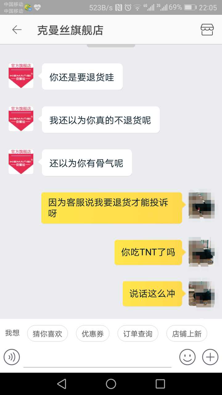 第一次,卖家直接拒绝了我,并故意来挑衅我。我跟她说了要投诉以后,才同意退货的。