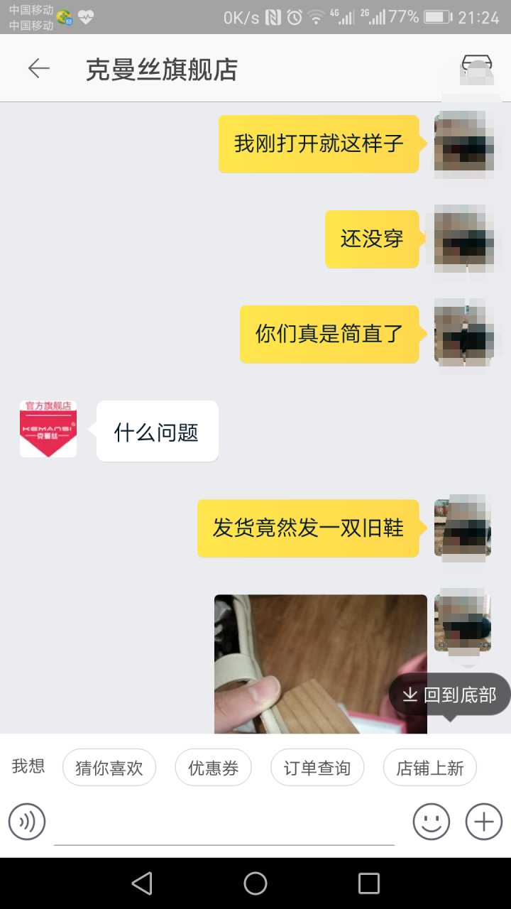 刚开始,我觉得卖家发我这么一双脏脏的鞋子,起码得跟我解释解释吧?然后卖家说,是木头跟,跟我解释不清,让我退货。你还没解释就说解释不清,我当时可能气上加气